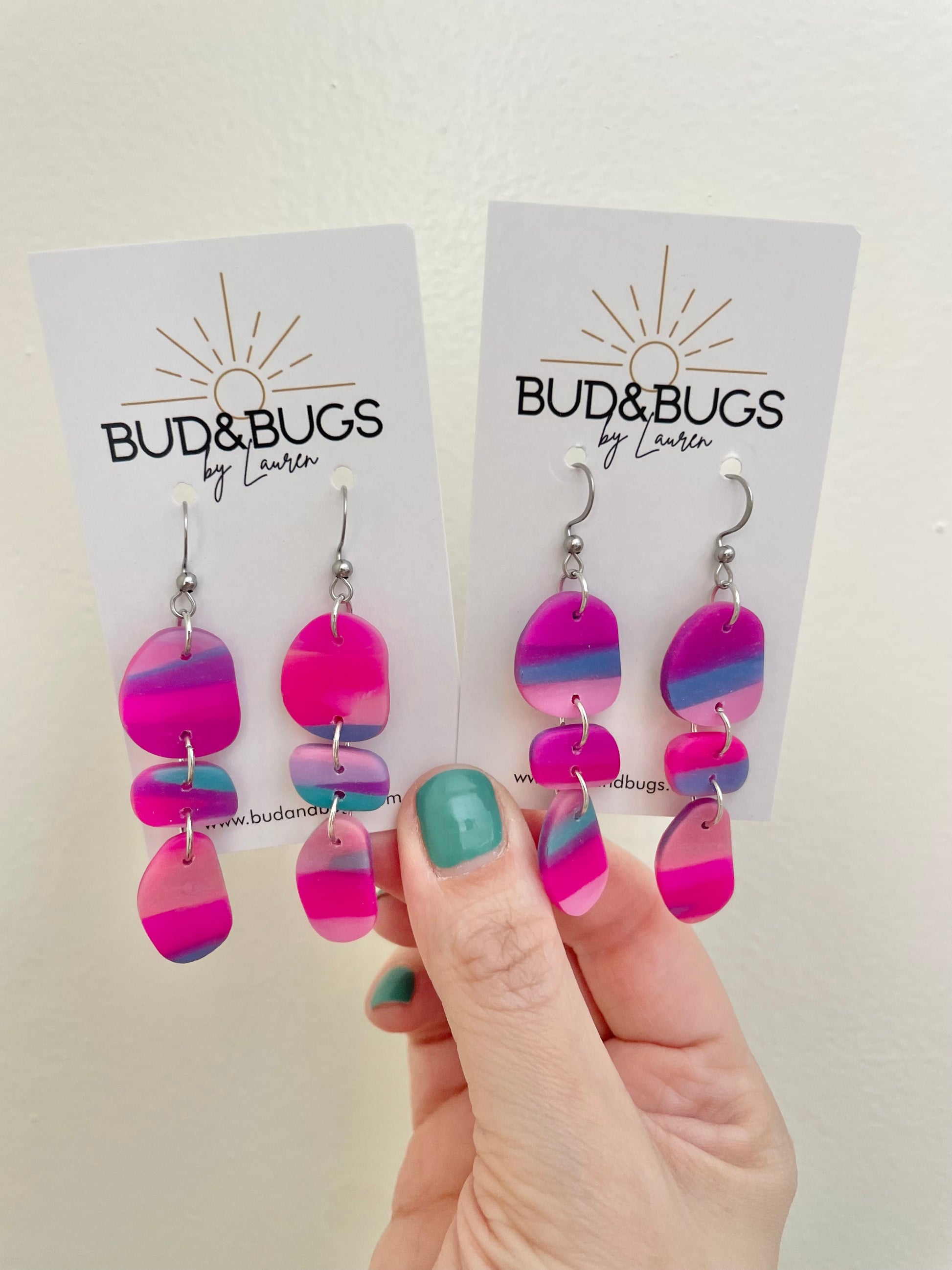 Bud & Bugs earrings should avoid water, cleansers, and lotions.