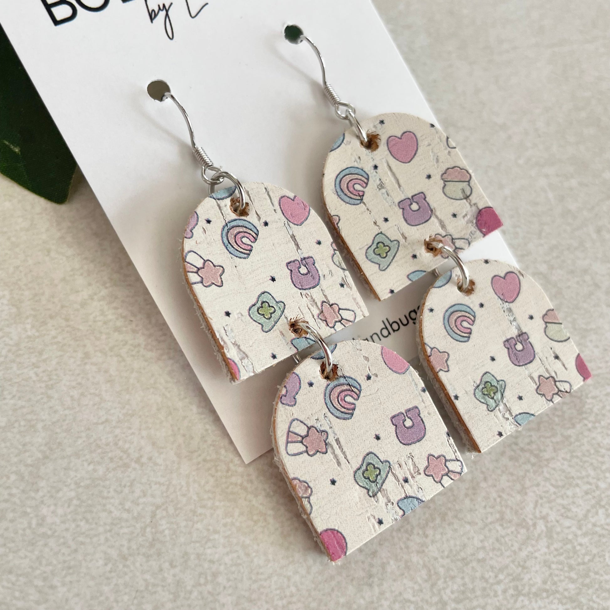 Handcrafted cork fabric over genuine leather dangle earrings; larger in size, lightweight, nickel free, and hypoallergenic.